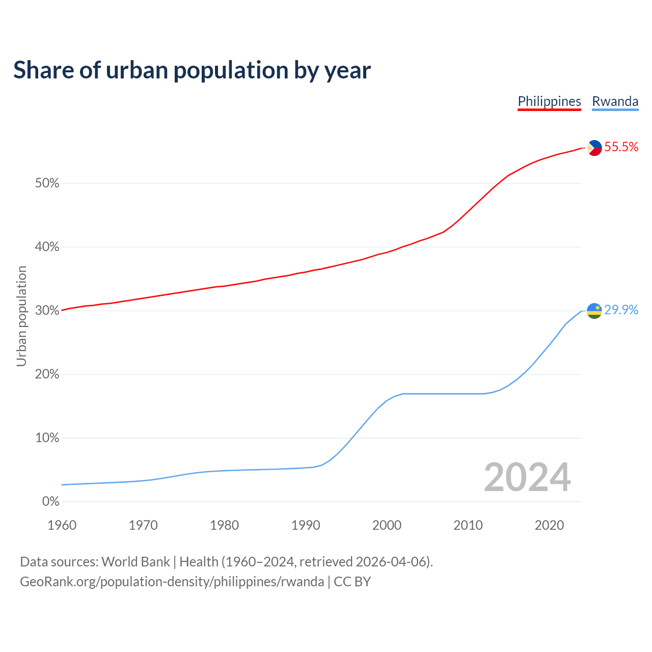 From 2004 to 2024, the share of urban population changed from 40.9% to 55.5% in the Philippines and from 16.9% to 29.9% in Rwanda.
