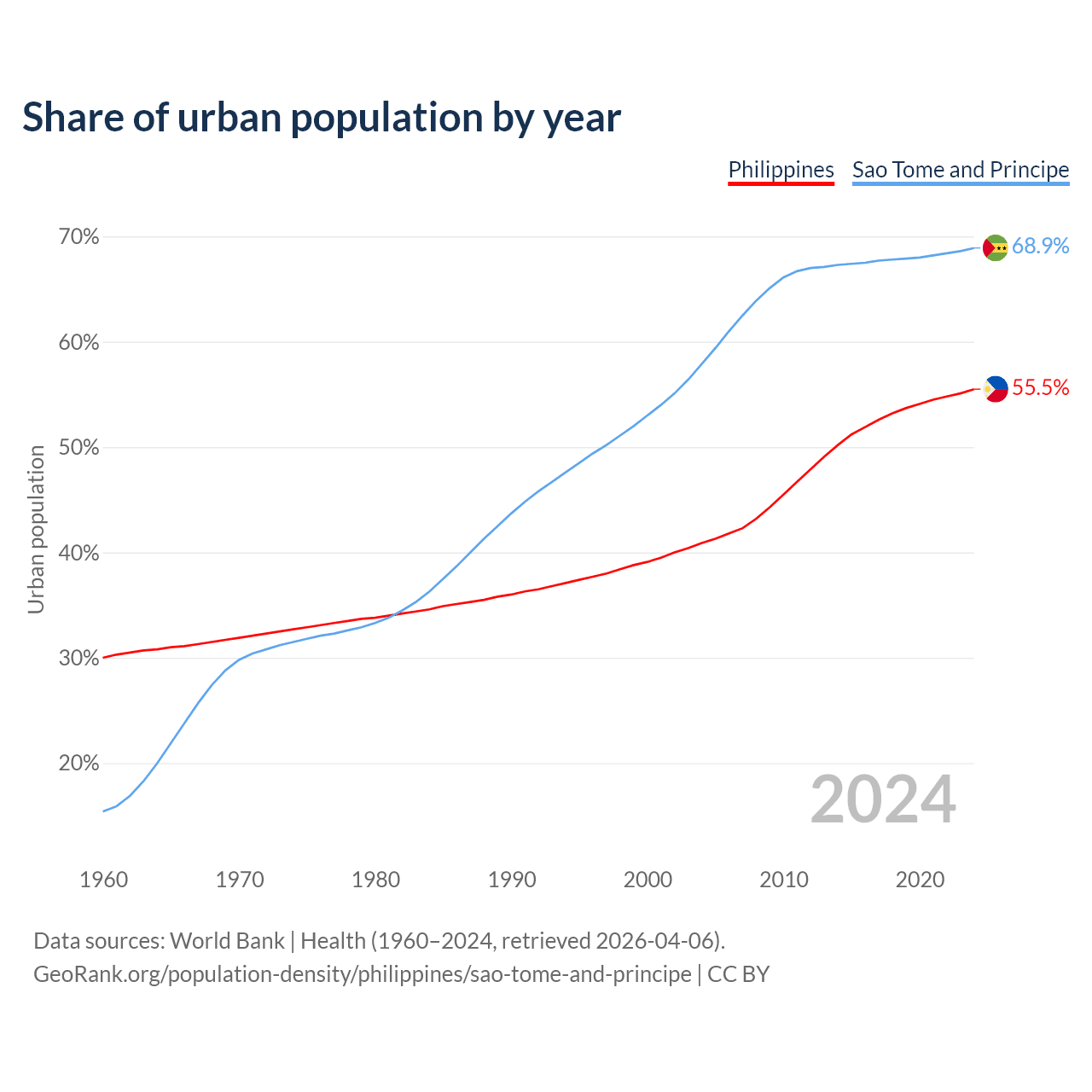 From 2004 to 2024, the share of urban population changed from 40.9% to 55.5% in the Philippines and from 57.9% to 68.9% in Sao Tome and Principe.