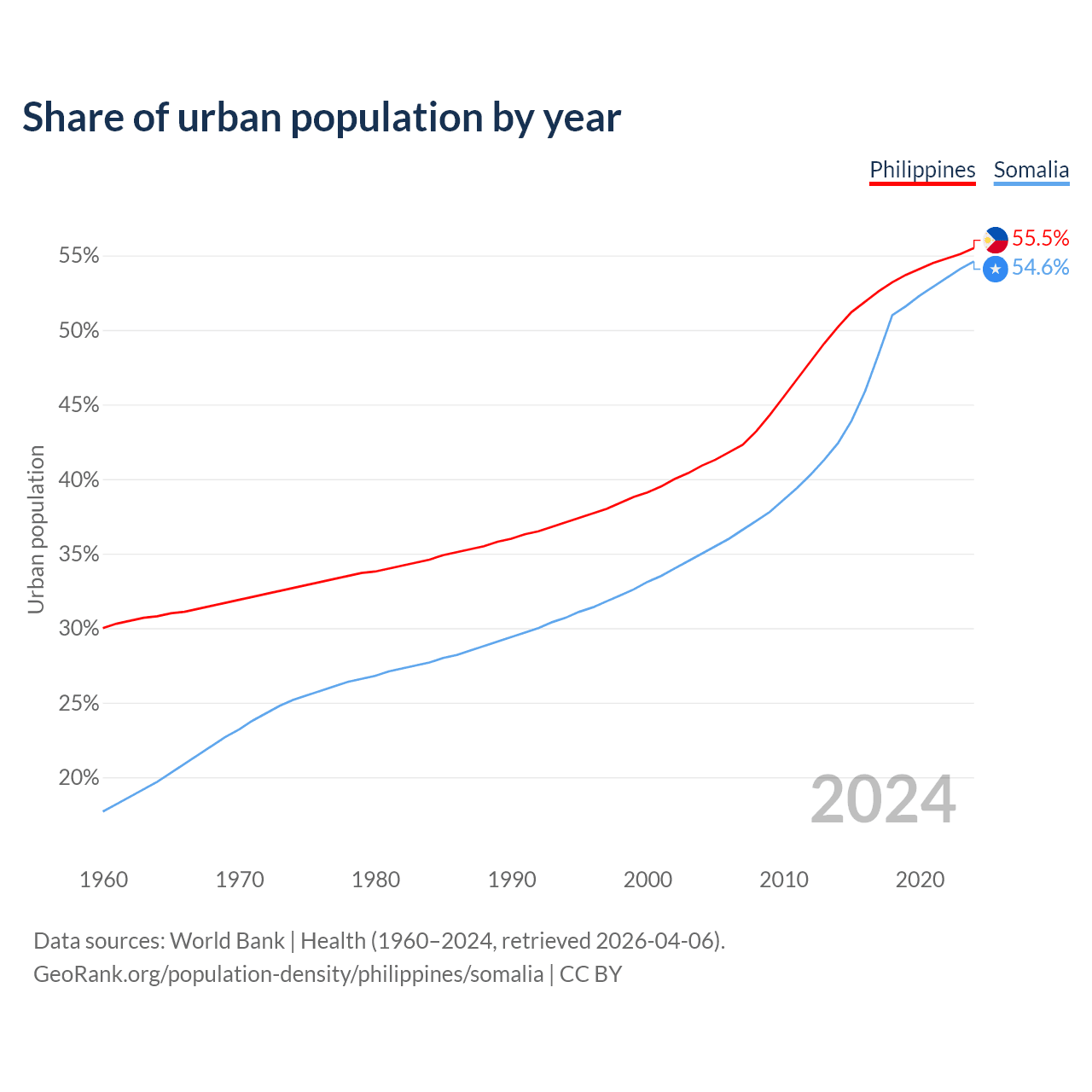 From 2004 to 2024, the share of urban population changed from 40.9% to 55.5% in the Philippines and from 35% to 54.6% in Somalia.