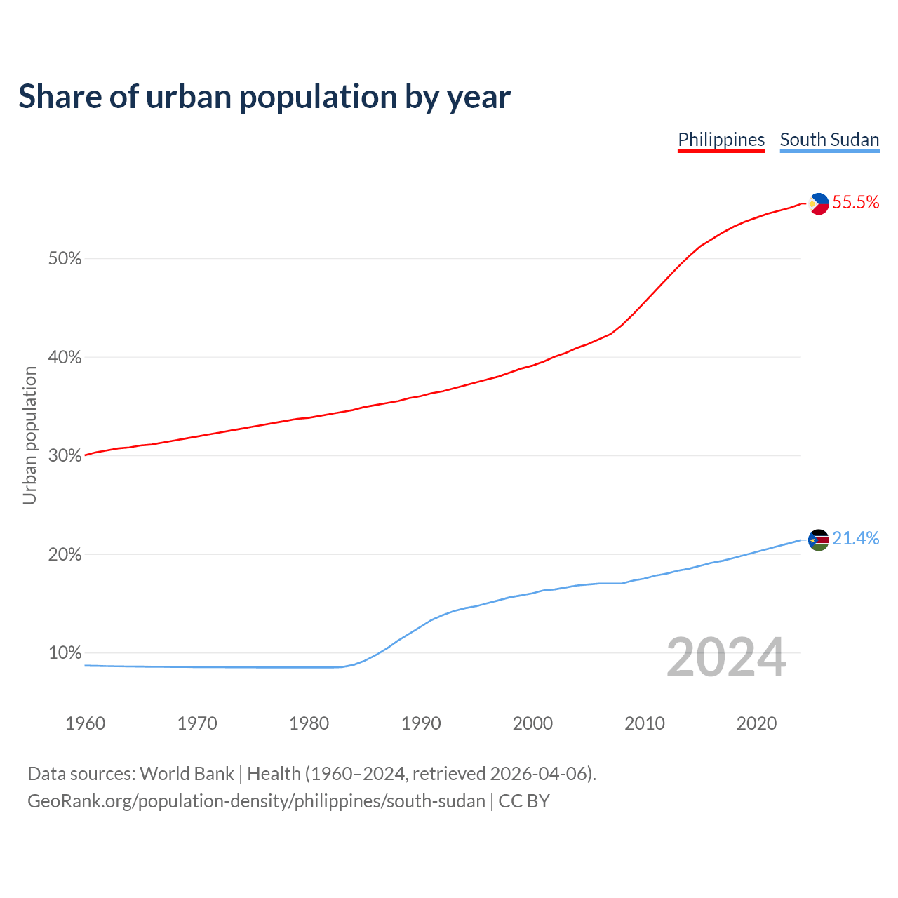 From 2004 to 2024, the share of urban population changed from 40.9% to 55.5% in the Philippines and from 16.8% to 21.4% in South Sudan.