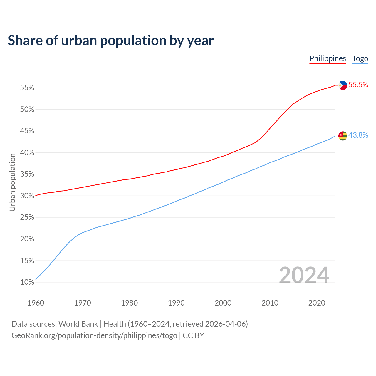 From 2004 to 2024, the share of urban population changed from 40.9% to 55.5% in the Philippines and from 34.9% to 43.8% in Togo.
