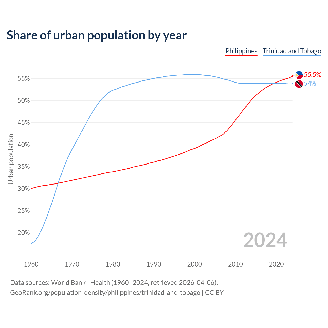 From 2004 to 2024, the share of urban population changed from 40.9% to 55.5% in the Philippines and from 55.6% to 54% in Trinidad and Tobago.