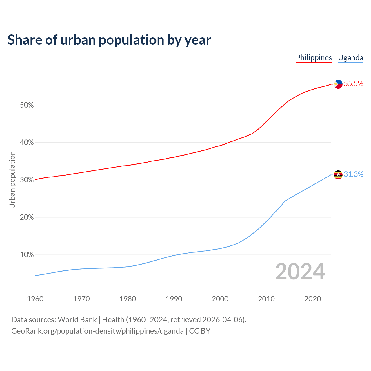 From 2004 to 2024, the share of urban population changed from 40.9% to 55.5% in the Philippines and from 13.1% to 31.3% in Uganda.