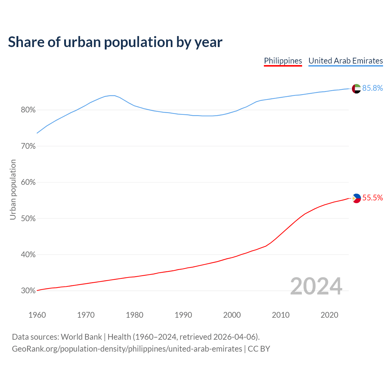 From 2004 to 2024, the share of urban population changed from 40.9% to 55.5% in the Philippines and from 81.5% to 85.8% in the United Arab Emirates.