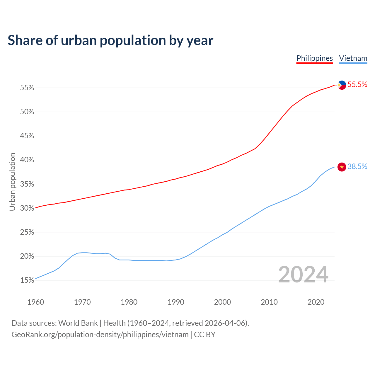 From 2004 to 2024, the share of urban population changed from 40.9% to 55.5% in the Philippines and from 26.8% to 38.5% in Vietnam.