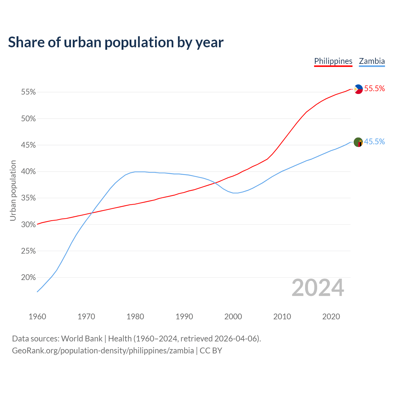 From 2004 to 2024, the share of urban population changed from 40.9% to 55.5% in the Philippines and from 36.8% to 45.5% in Zambia.