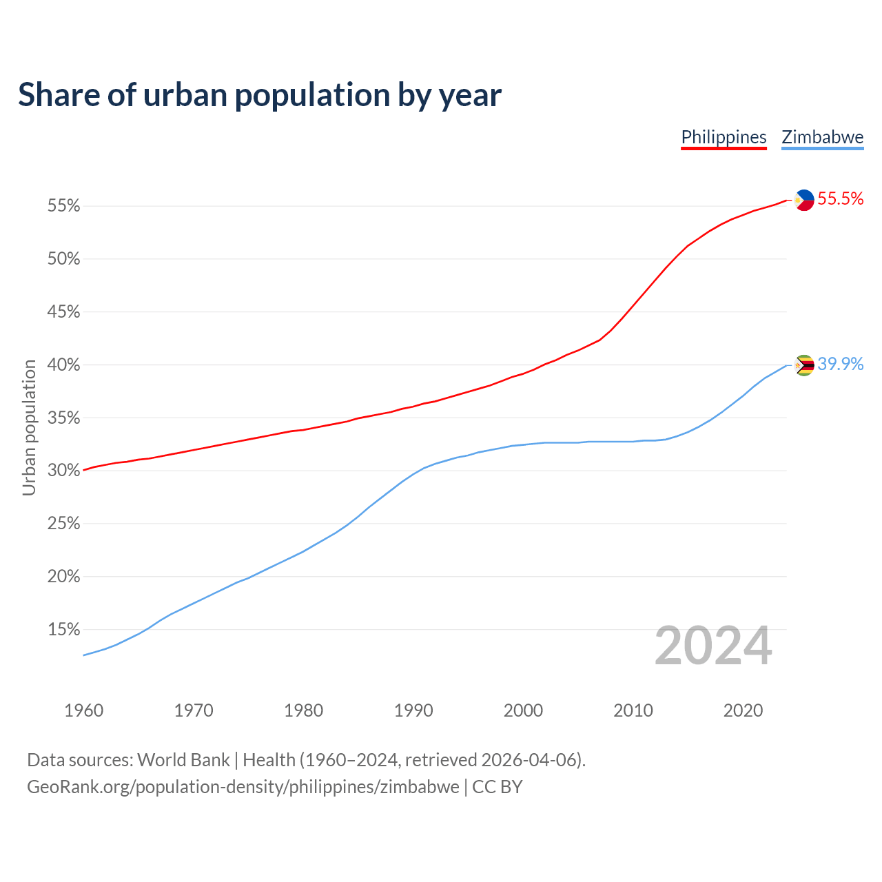 From 2004 to 2024, the share of urban population changed from 40.9% to 55.5% in the Philippines and from 32.6% to 39.9% in Zimbabwe.
