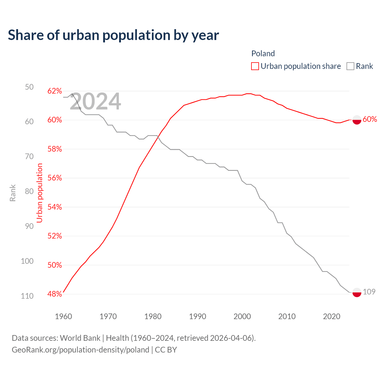 This chart shows the share of urban population in Poland from 1960 to 2024: 48.1% lived in urban areas in 1960, 61.7% in 2000, and 60% in 2024.