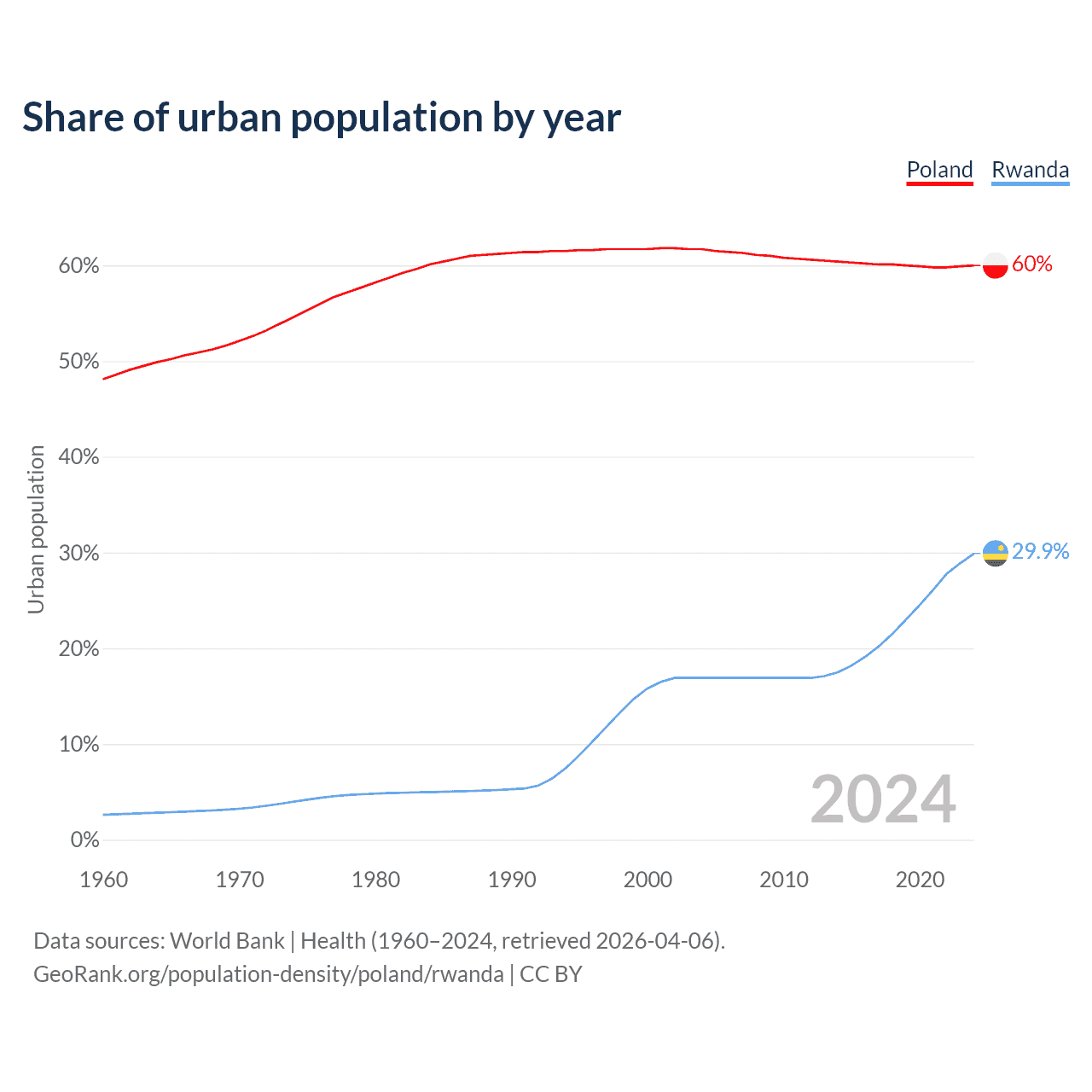 From 2004 to 2024, the share of urban population changed from 61.7% to 60% in Poland and from 16.9% to 29.9% in Rwanda.