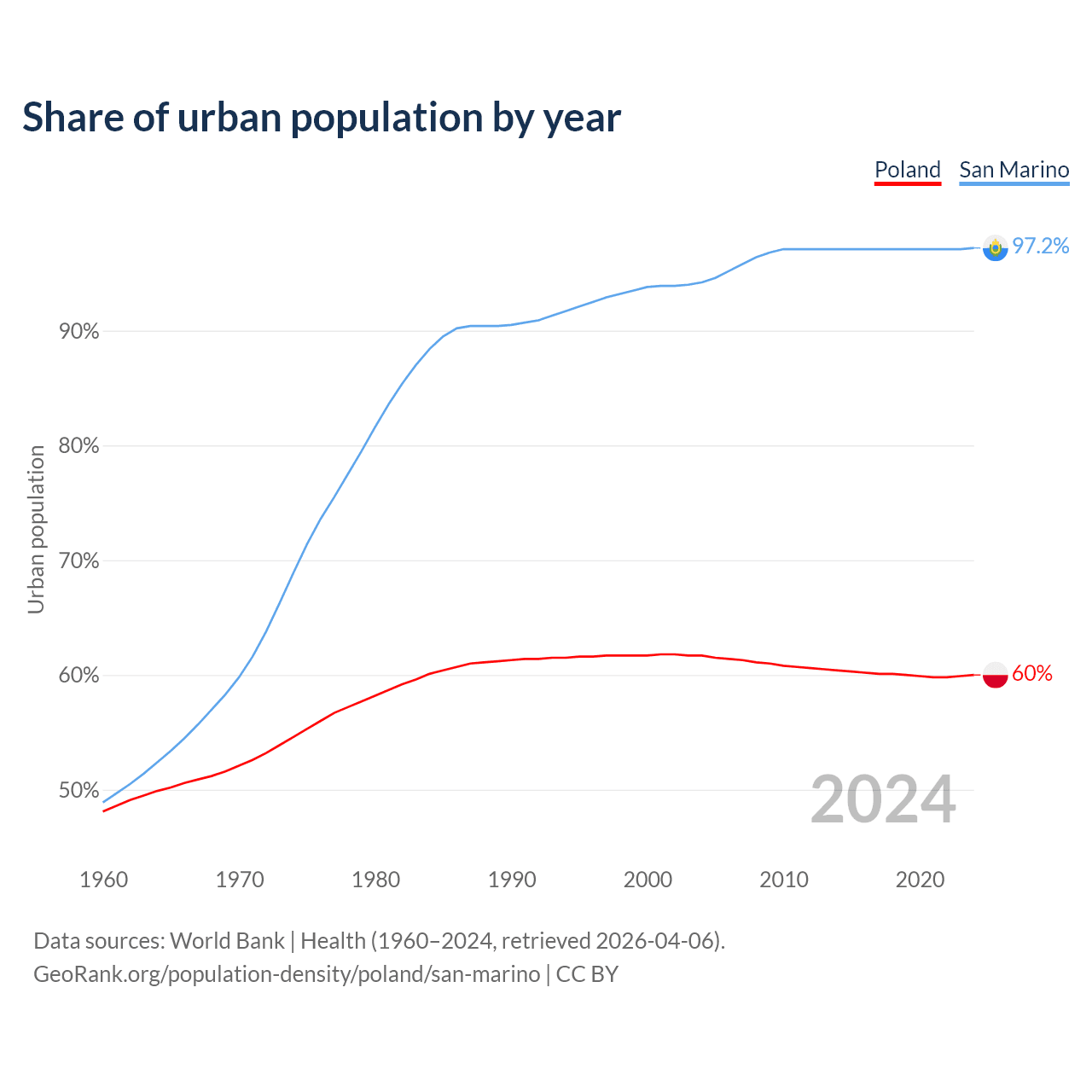From 2004 to 2024, the share of urban population changed from 61.7% to 60% in Poland and from 94.2% to 97.2% in San Marino.