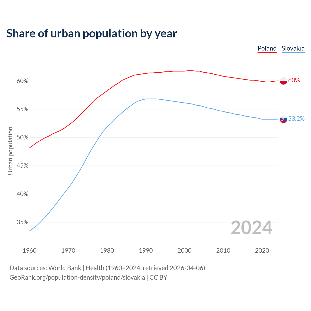 From 2004 to 2024, the share of urban population changed from 61.7% to 60% in Poland and from 55.6% to 53.2% in Slovakia.