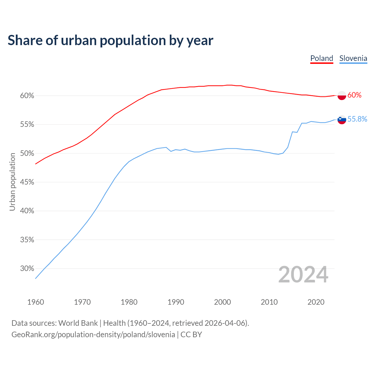 From 2004 to 2024, the share of urban population changed from 61.7% to 60% in Poland and from 50.7% to 55.8% in Slovenia.