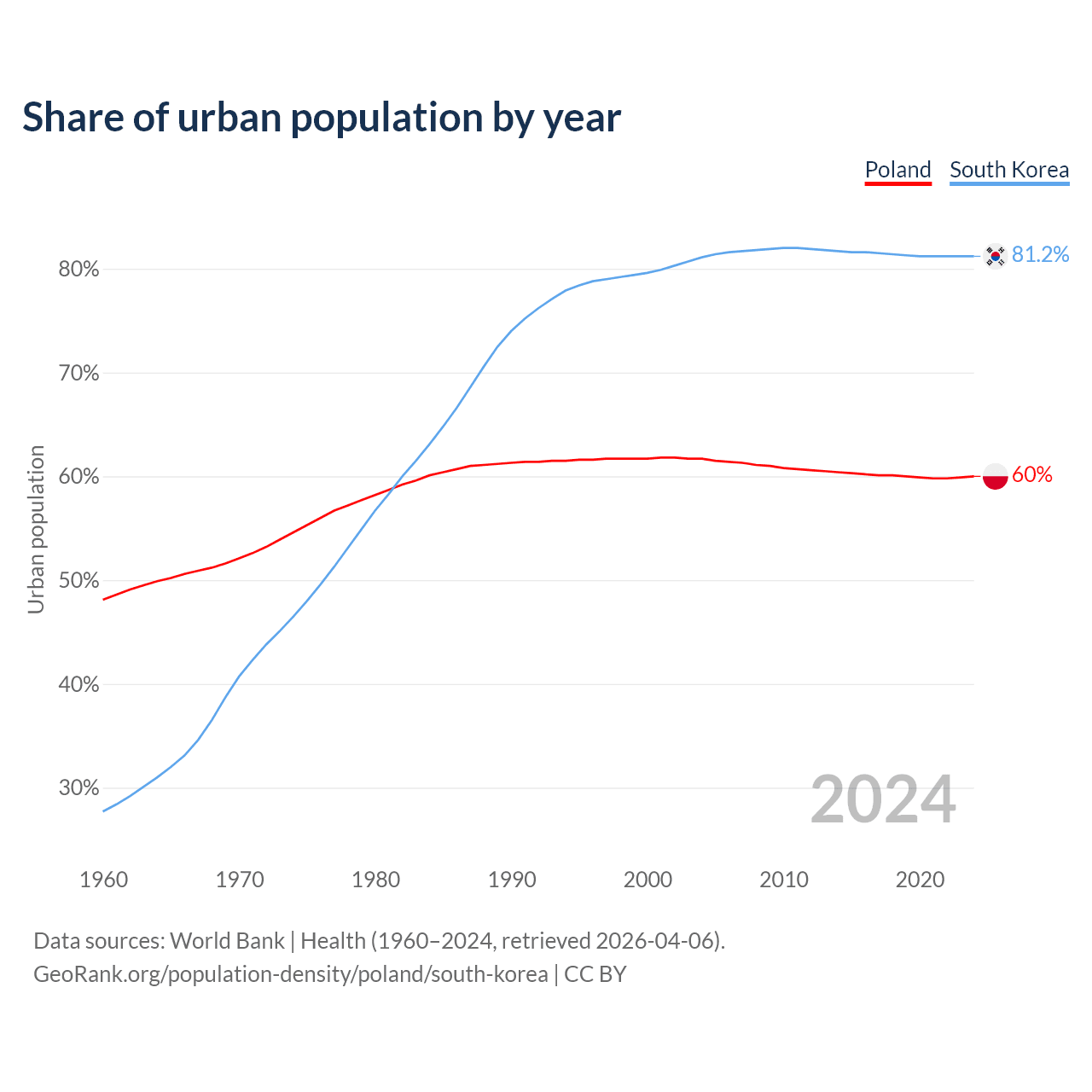 From 2004 to 2024, the share of urban population changed from 61.7% to 60% in Poland and from 81.1% to 81.2% in South Korea.