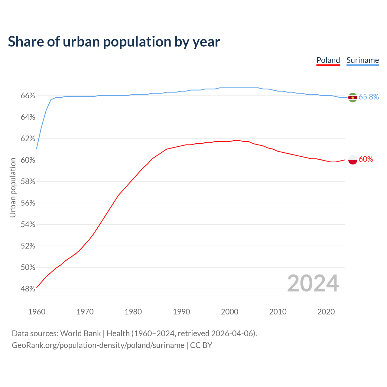 From 2004 to 2024, the share of urban population changed from 61.7% to 60% in Poland and from 66.7% to 65.8% in Suriname.