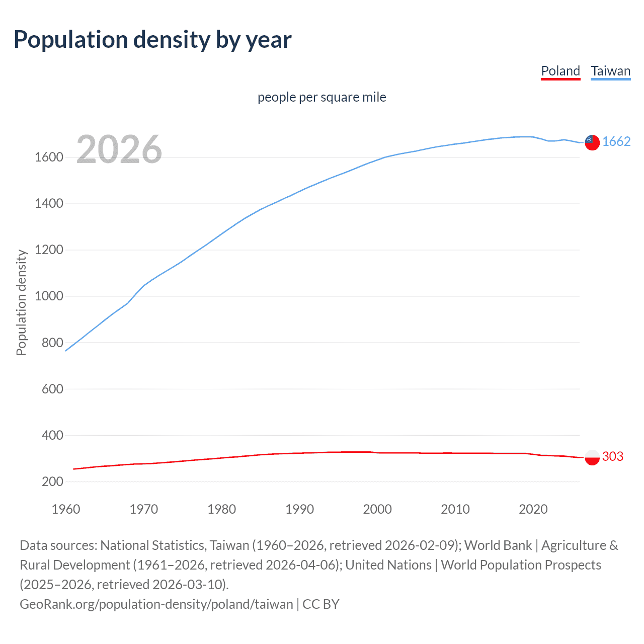 Data sources: World Bank | Agriculture & Rural Development (1961–2026, retrieved 2026-04-06); United Nations | World Population Prospects (1961–2026, retrieved 2026-03-10); National Statistics, Taiwan (1961–2026, retrieved 2026-02-09); U.S. Census Bureau (1961–2025, retrieved 2026-02-08); Central Intelligence Agency (CIA) (2000–2019, retrieved 2026-02-20).