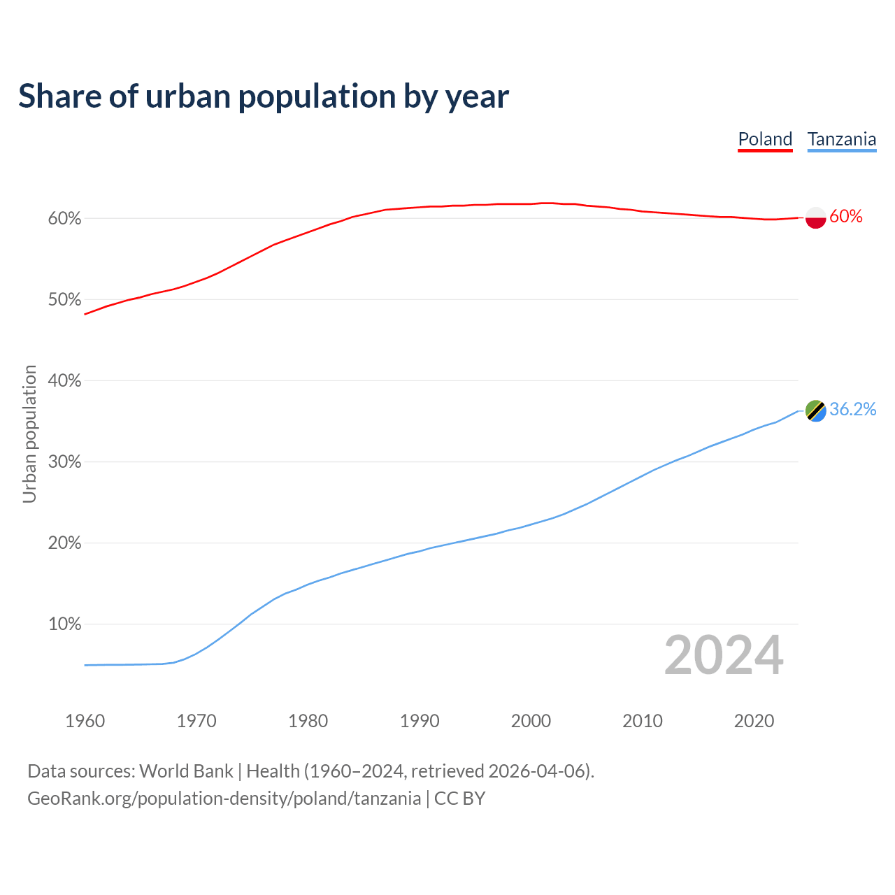 From 2004 to 2024, the share of urban population changed from 61.7% to 60% in Poland and from 24.1% to 36.2% in Tanzania.