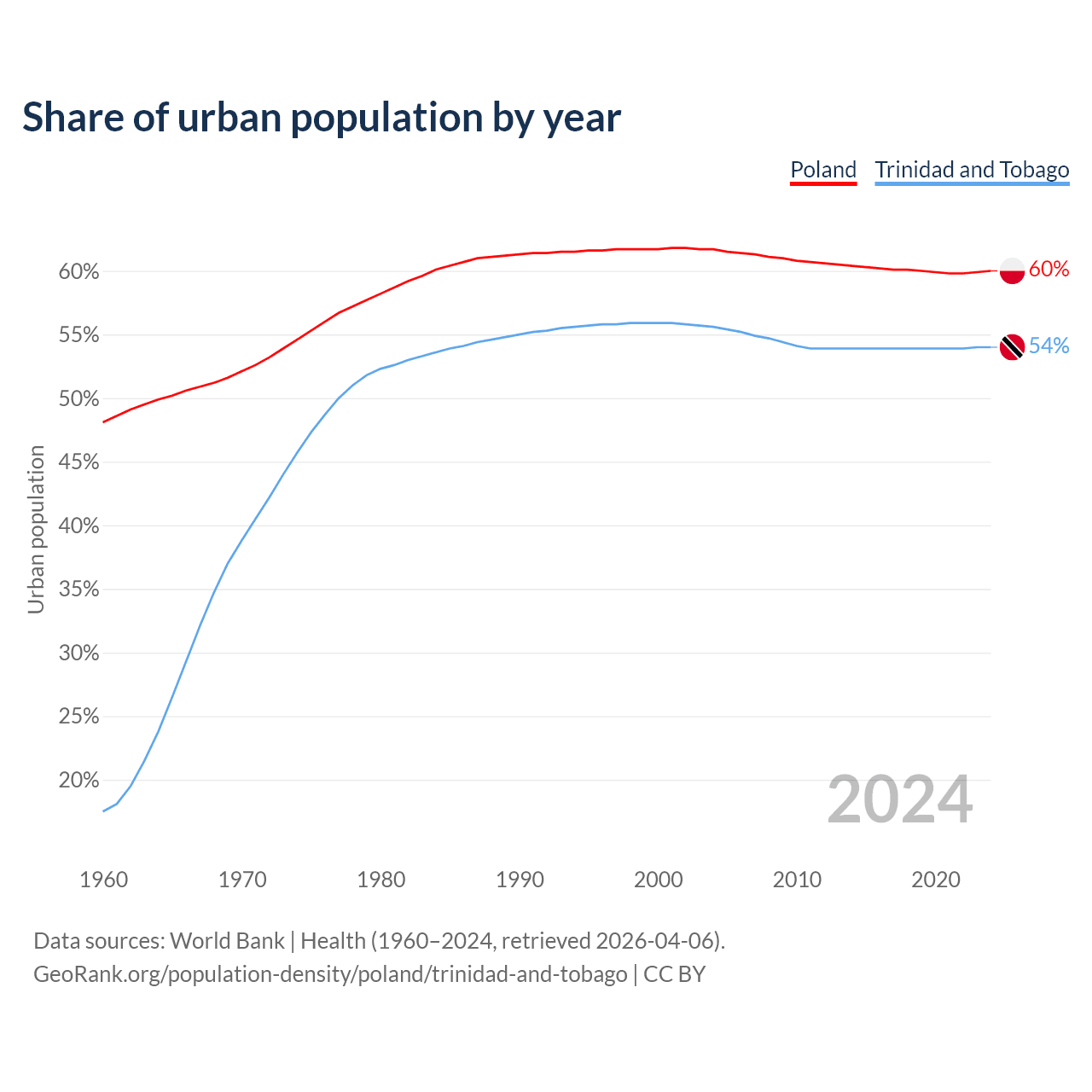 From 2004 to 2024, the share of urban population changed from 61.7% to 60% in Poland and from 55.6% to 54% in Trinidad and Tobago.