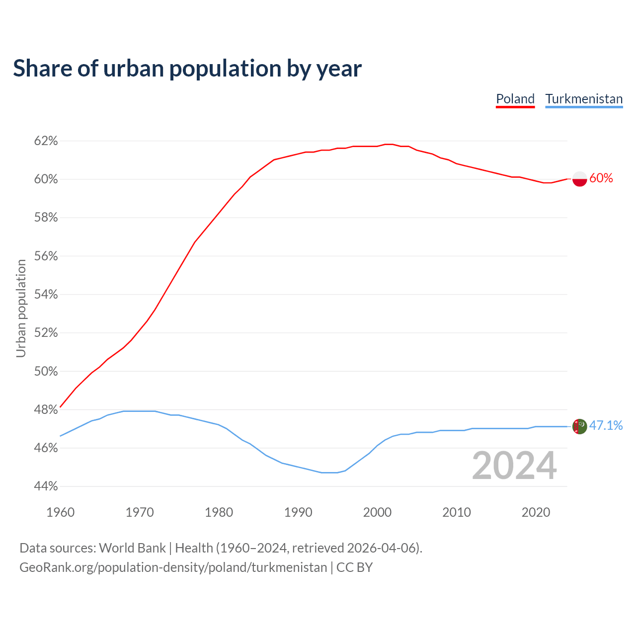 From 2004 to 2024, the share of urban population changed from 61.7% to 60% in Poland and from 46.7% to 47.1% in Turkmenistan.