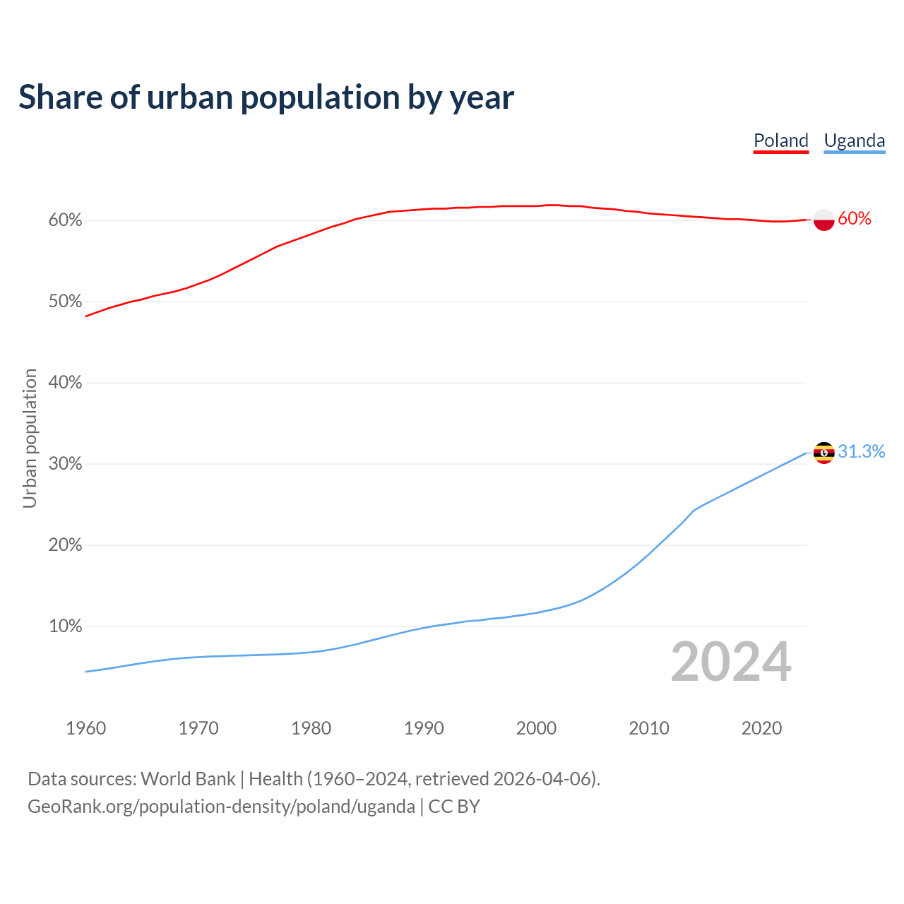 From 2004 to 2024, the share of urban population changed from 61.7% to 60% in Poland and from 13.1% to 31.3% in Uganda.