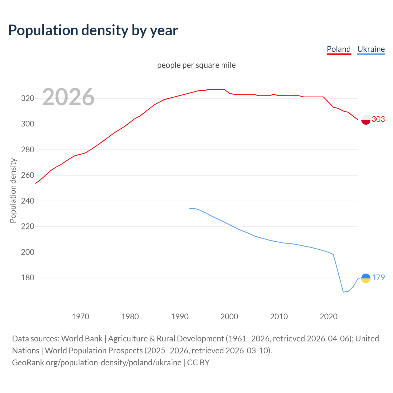 From 2006 to 2026, population density in Poland decreased by 6.1%, compared to a 15.1% decline in Ukraine.