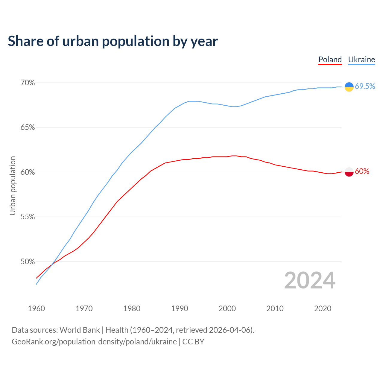 From 2004 to 2024, the share of urban population changed from 61.7% to 60% in Poland and from 67.6% to 69.5% in Ukraine.