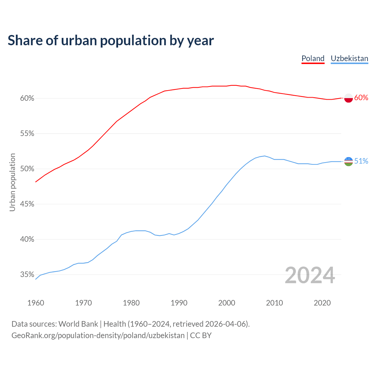 From 2004 to 2024, the share of urban population changed from 61.7% to 60% in Poland and from 50.6% to 51% in Uzbekistan.