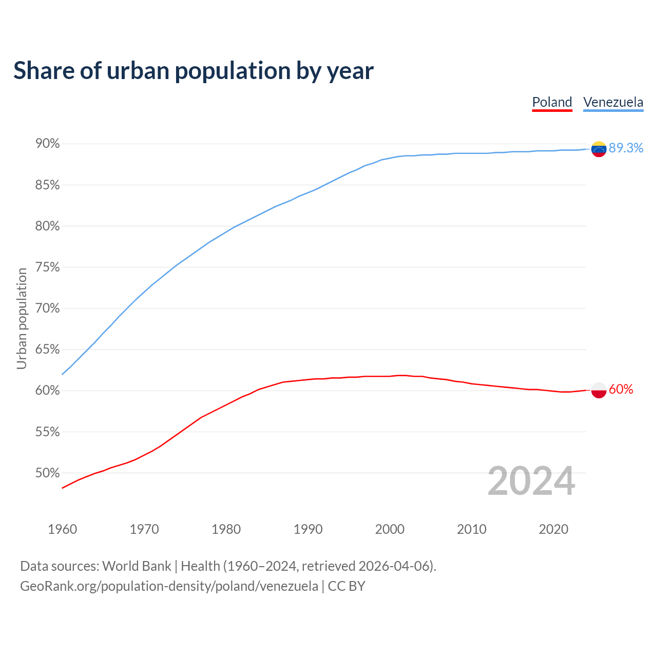 From 2004 to 2024, the share of urban population changed from 61.7% to 60% in Poland and from 88.6% to 89.3% in Venezuela.