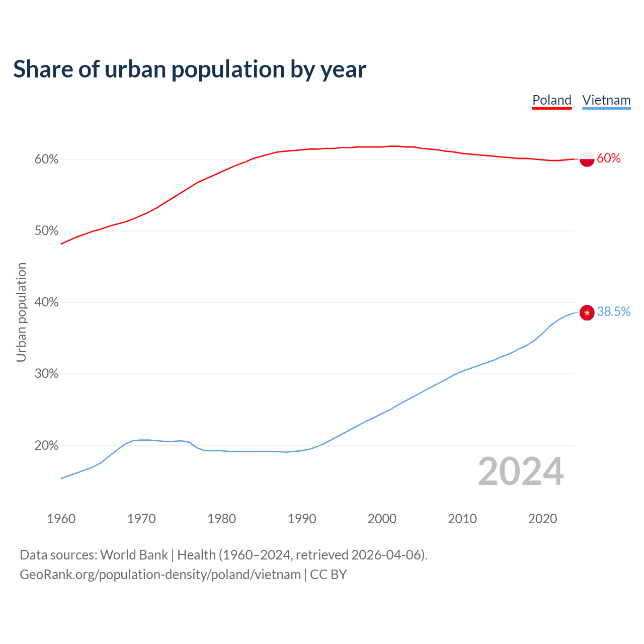 From 2004 to 2024, the share of urban population changed from 61.7% to 60% in Poland and from 26.8% to 38.5% in Vietnam.
