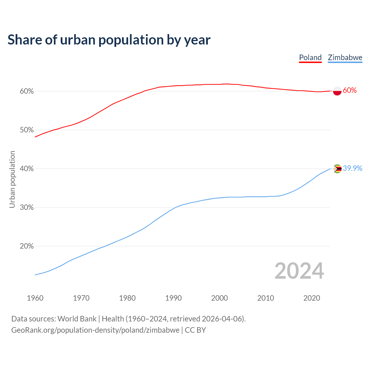 From 2004 to 2024, the share of urban population changed from 61.7% to 60% in Poland and from 32.6% to 39.9% in Zimbabwe.