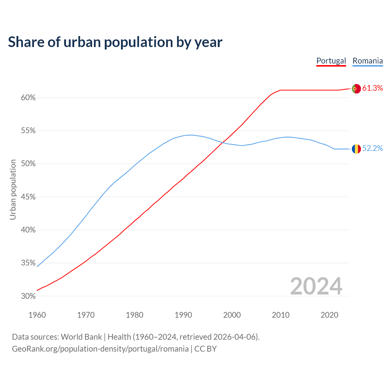 From 2004 to 2024, the share of urban population changed from 57.4% to 61.3% in Portugal and from 52.9% to 52.2% in Romania.