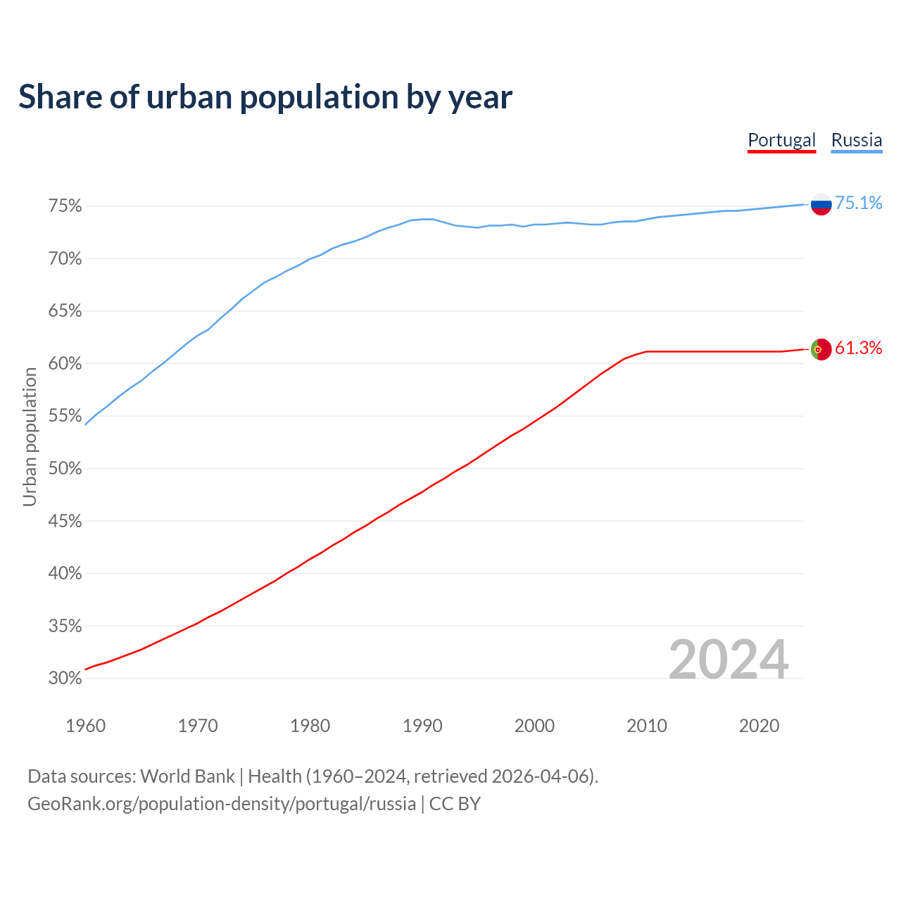 From 2004 to 2024, the share of urban population changed from 57.4% to 61.3% in Portugal and from 73.3% to 75.1% in Russia.