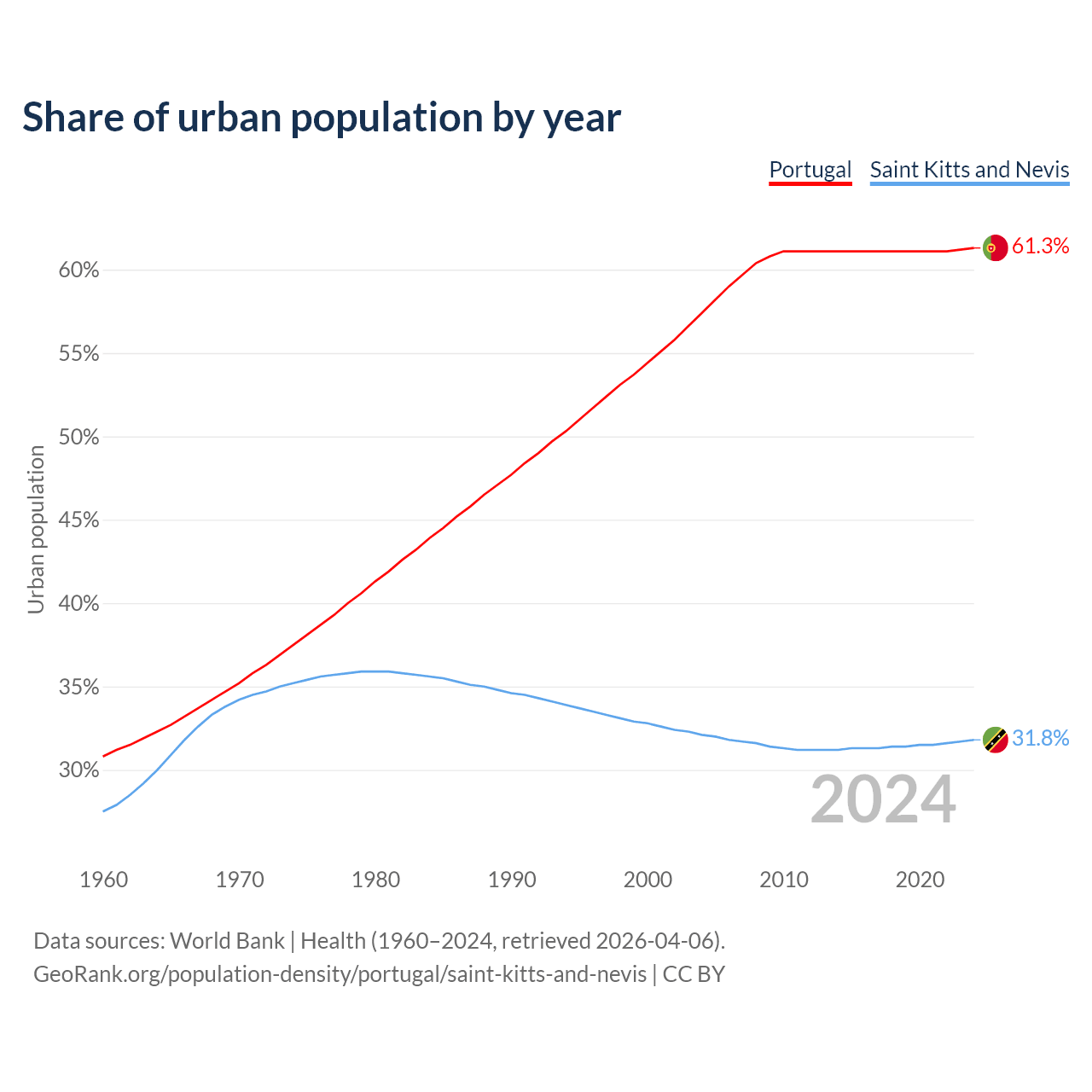 From 2004 to 2024, the share of urban population changed from 57.4% to 61.3% in Portugal and from 32.1% to 31.8% in Saint Kitts and Nevis.
