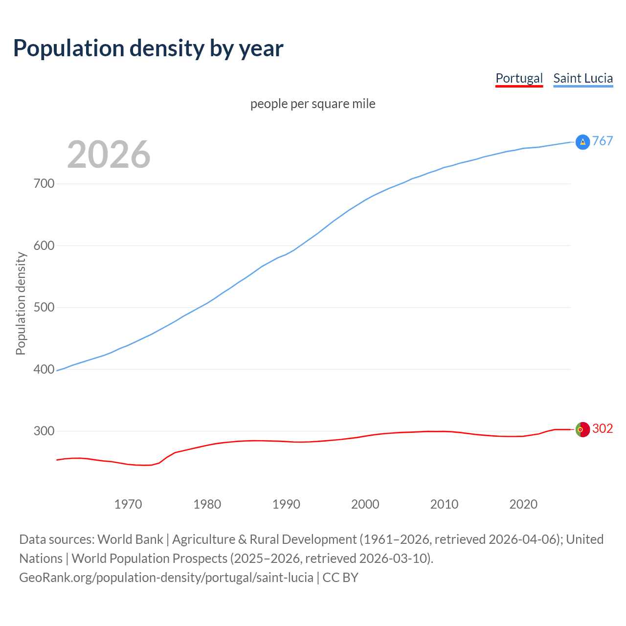 From 2006 to 2026, population density in Portugal increased by 1.23%, compared to a 8.35% growth in Saint Lucia.