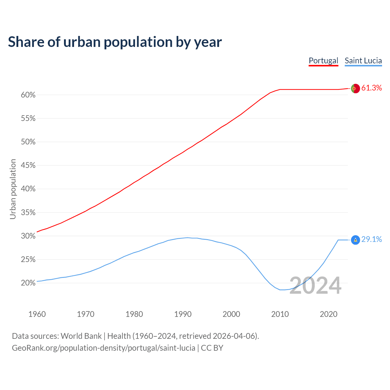 From 2004 to 2024, the share of urban population changed from 57.4% to 61.3% in Portugal and from 24.8% to 29.1% in Saint Lucia.