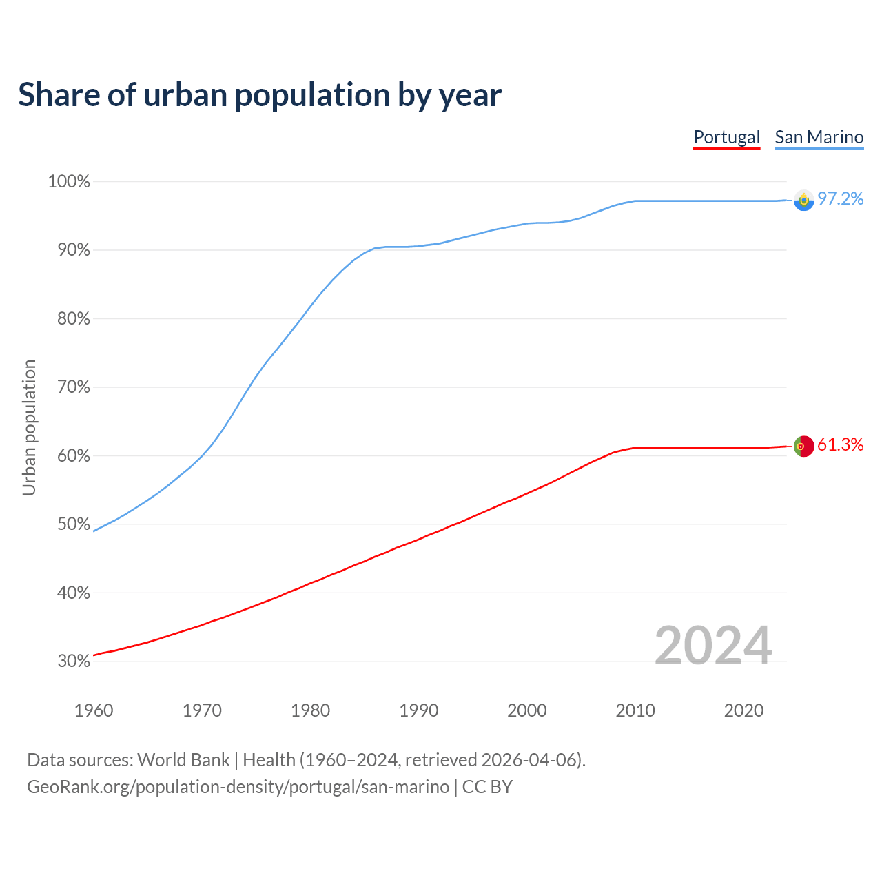 From 2004 to 2024, the share of urban population changed from 57.4% to 61.3% in Portugal and from 94.2% to 97.2% in San Marino.