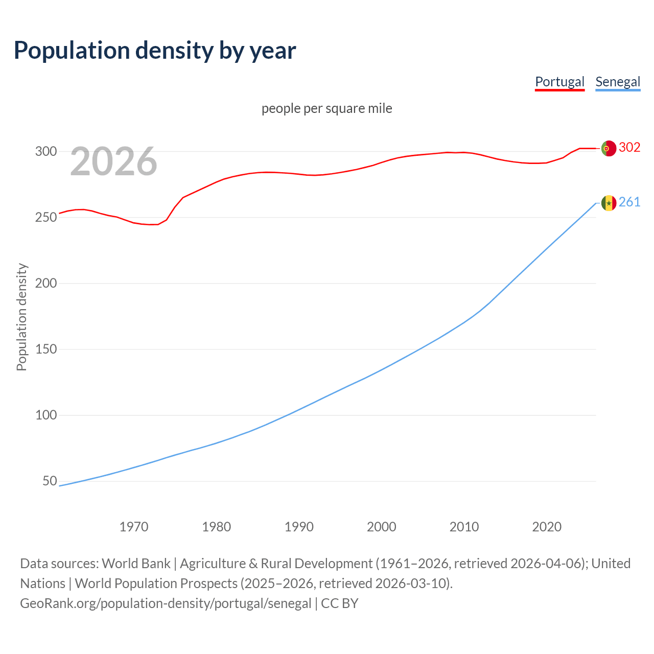 From 2006 to 2026, population density in Portugal increased by 1.23%, compared to a 68.5% growth in Senegal.