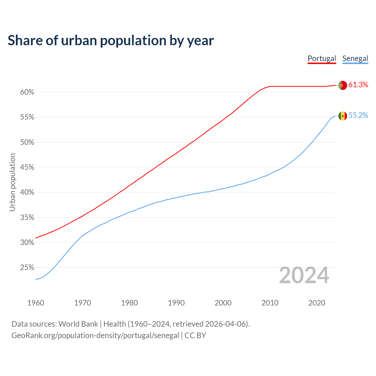 From 2004 to 2024, the share of urban population changed from 57.4% to 61.3% in Portugal and from 41.6% to 55.2% in Senegal.