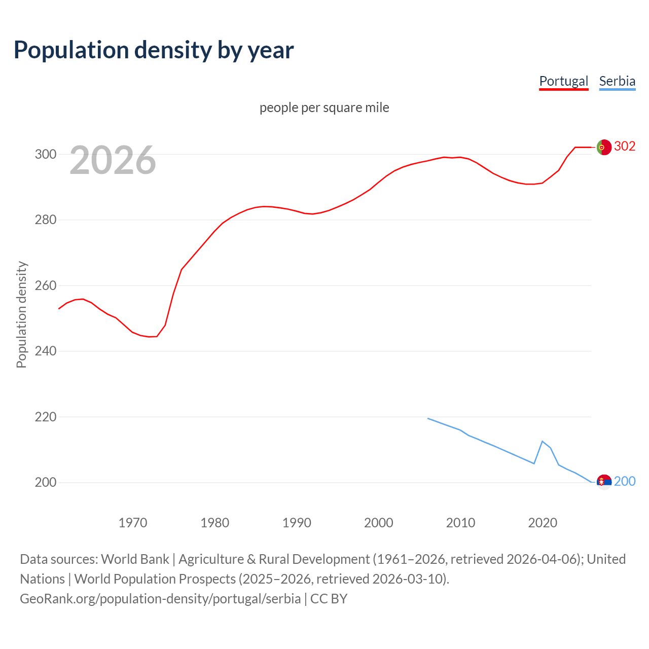 From 2006 to 2026, population density in Portugal increased by 1.23%, compared to a 8.86% decline in Serbia.