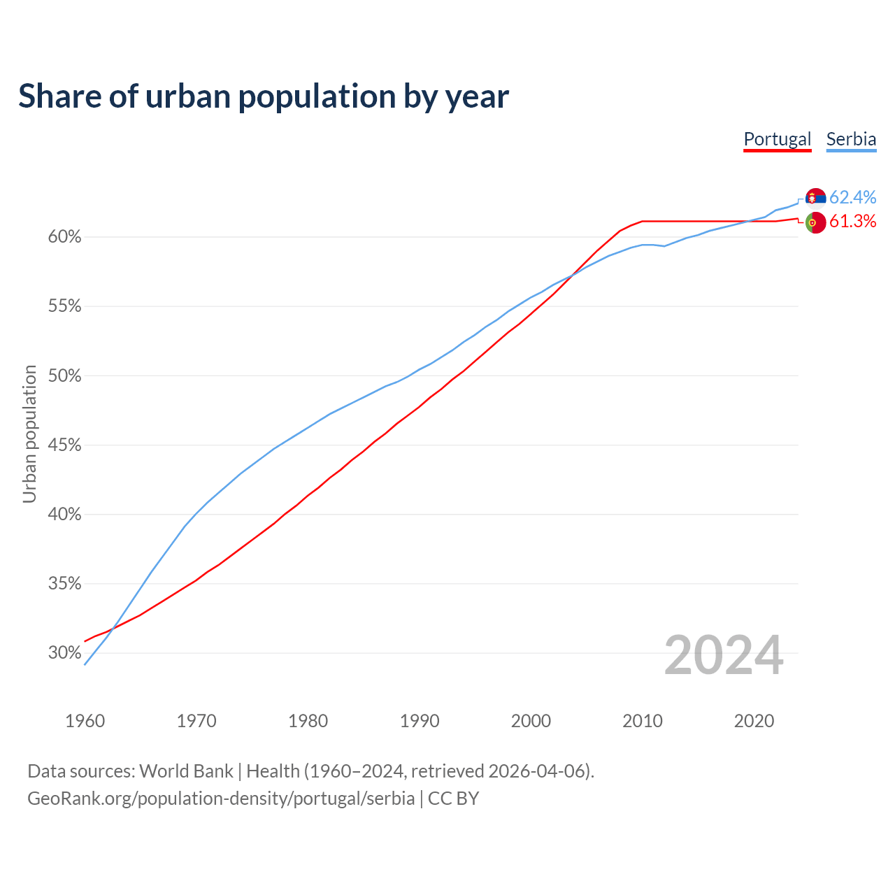 From 2004 to 2024, the share of urban population changed from 57.4% to 61.3% in Portugal and from 57.3% to 62.4% in Serbia.