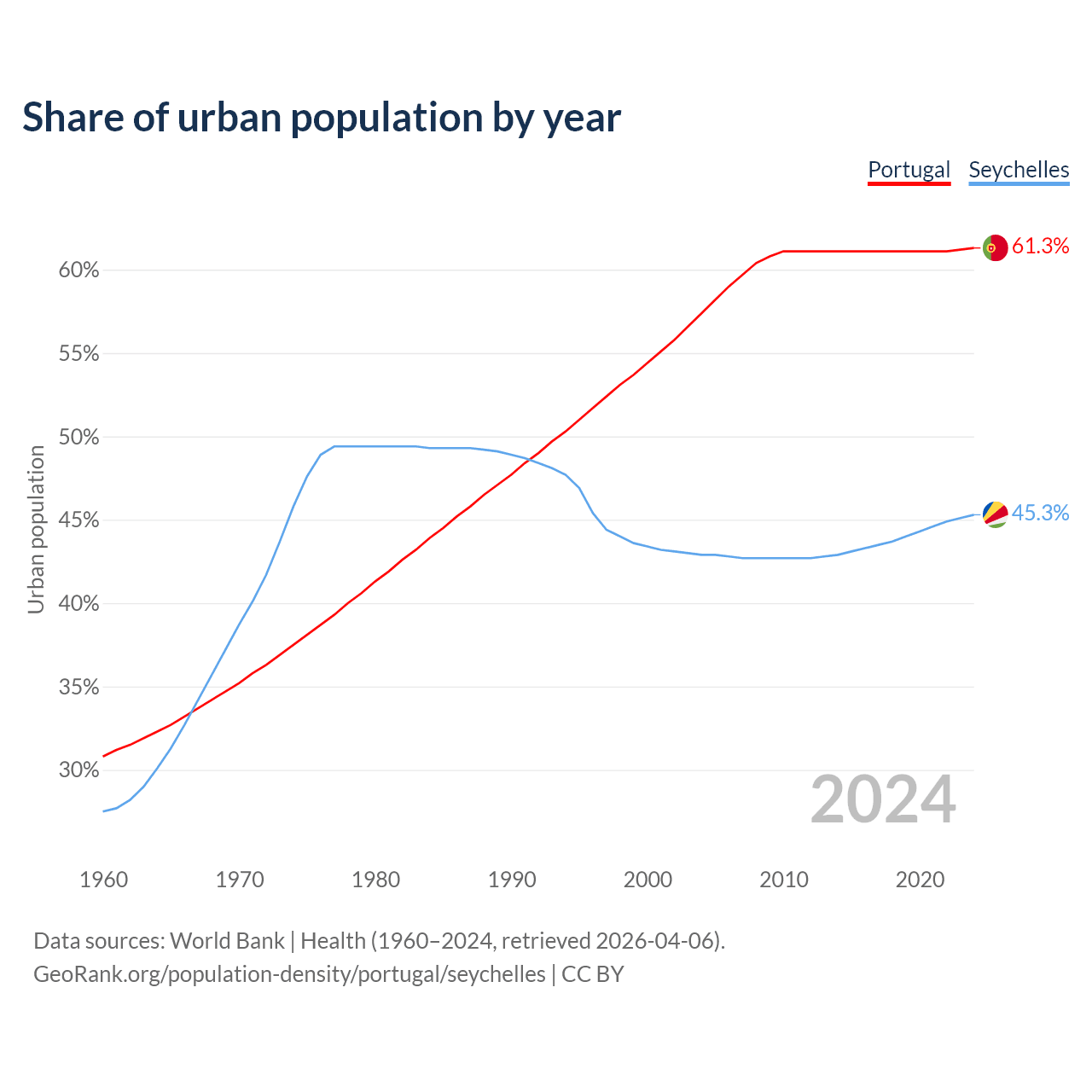 From 2004 to 2024, the share of urban population changed from 57.4% to 61.3% in Portugal and from 42.9% to 45.3% in the Seychelles.