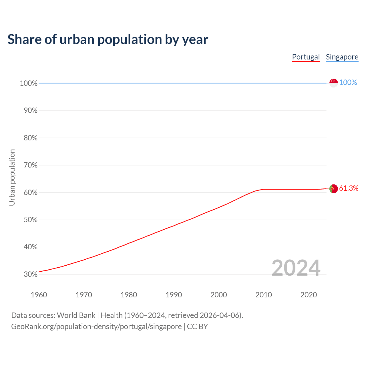 From 2004 to 2024, the share of urban population changed from 57.4% to 61.3% in Portugal and from 100% to 100% in Singapore.