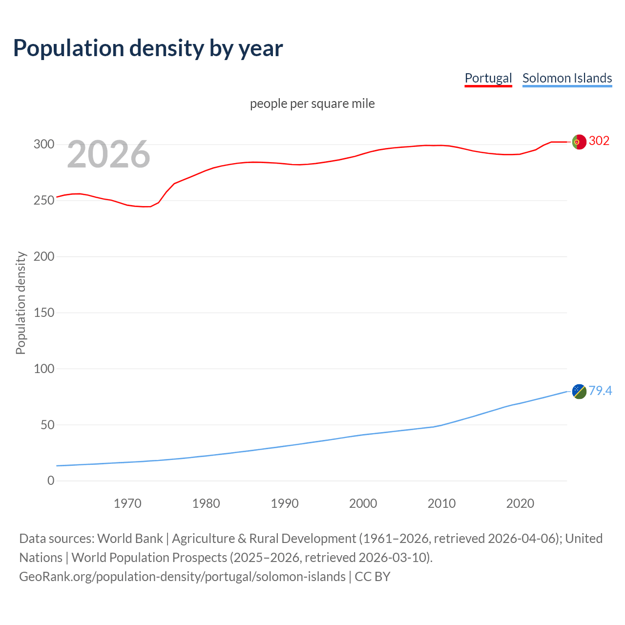 From 2006 to 2026, population density in Portugal increased by 1.23%, compared to a 74.6% growth in the Solomon Islands.
