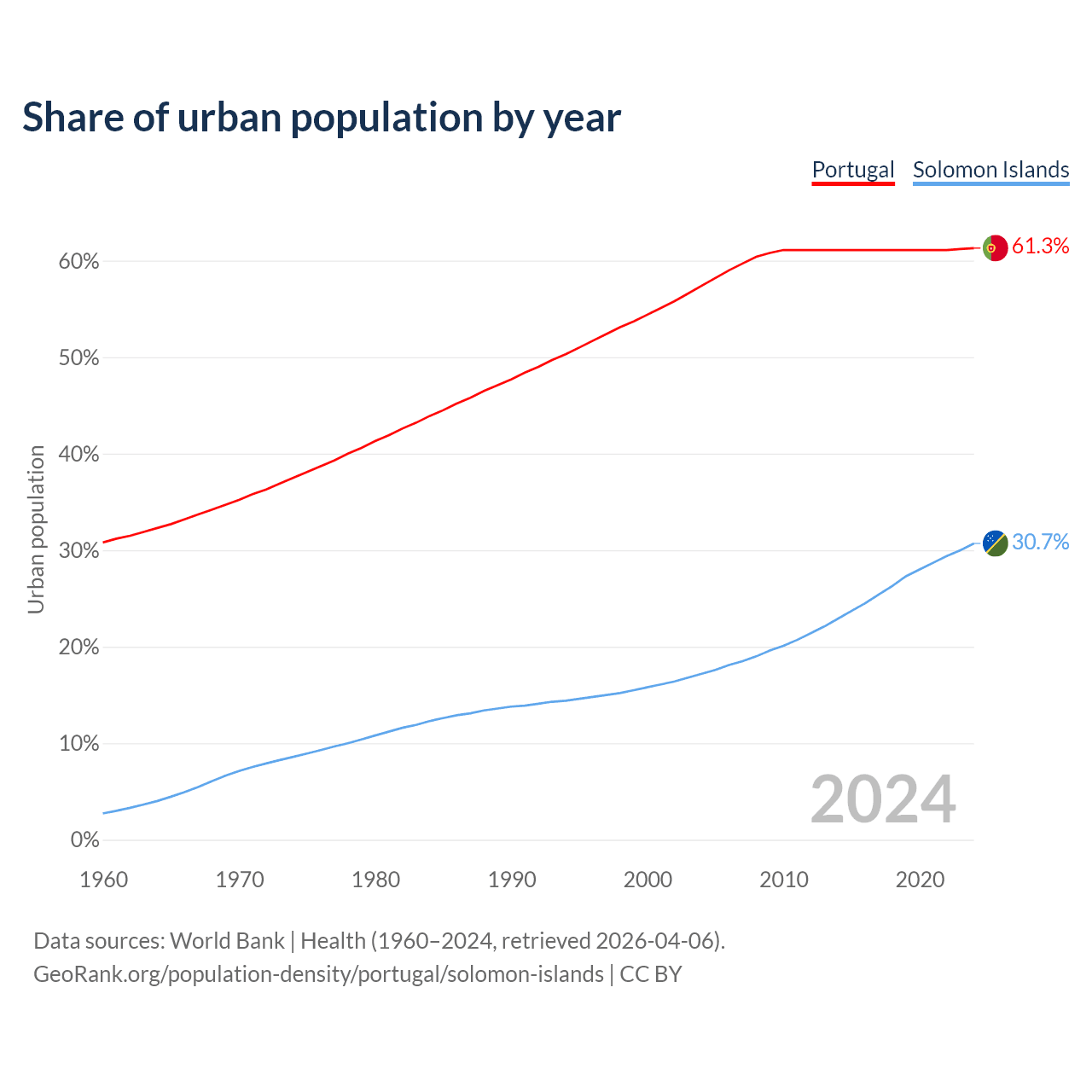 From 2004 to 2024, the share of urban population changed from 57.4% to 61.3% in Portugal and from 17.2% to 30.7% in the Solomon Islands.