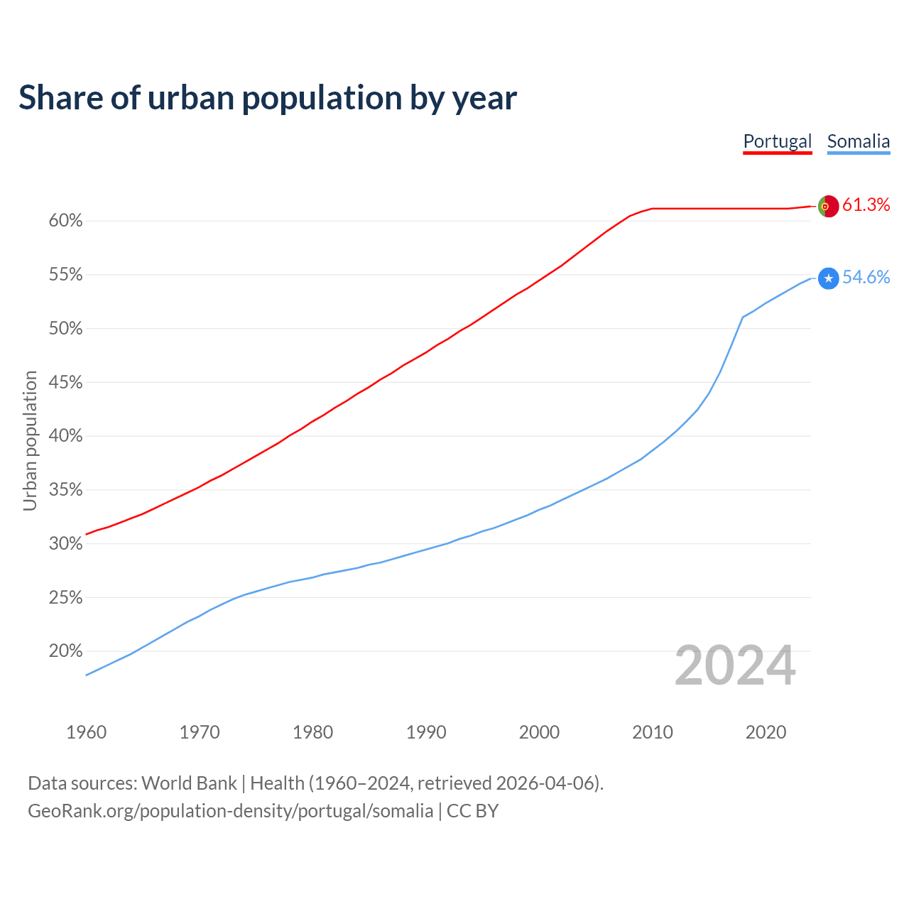 From 2004 to 2024, the share of urban population changed from 57.4% to 61.3% in Portugal and from 35% to 54.6% in Somalia.