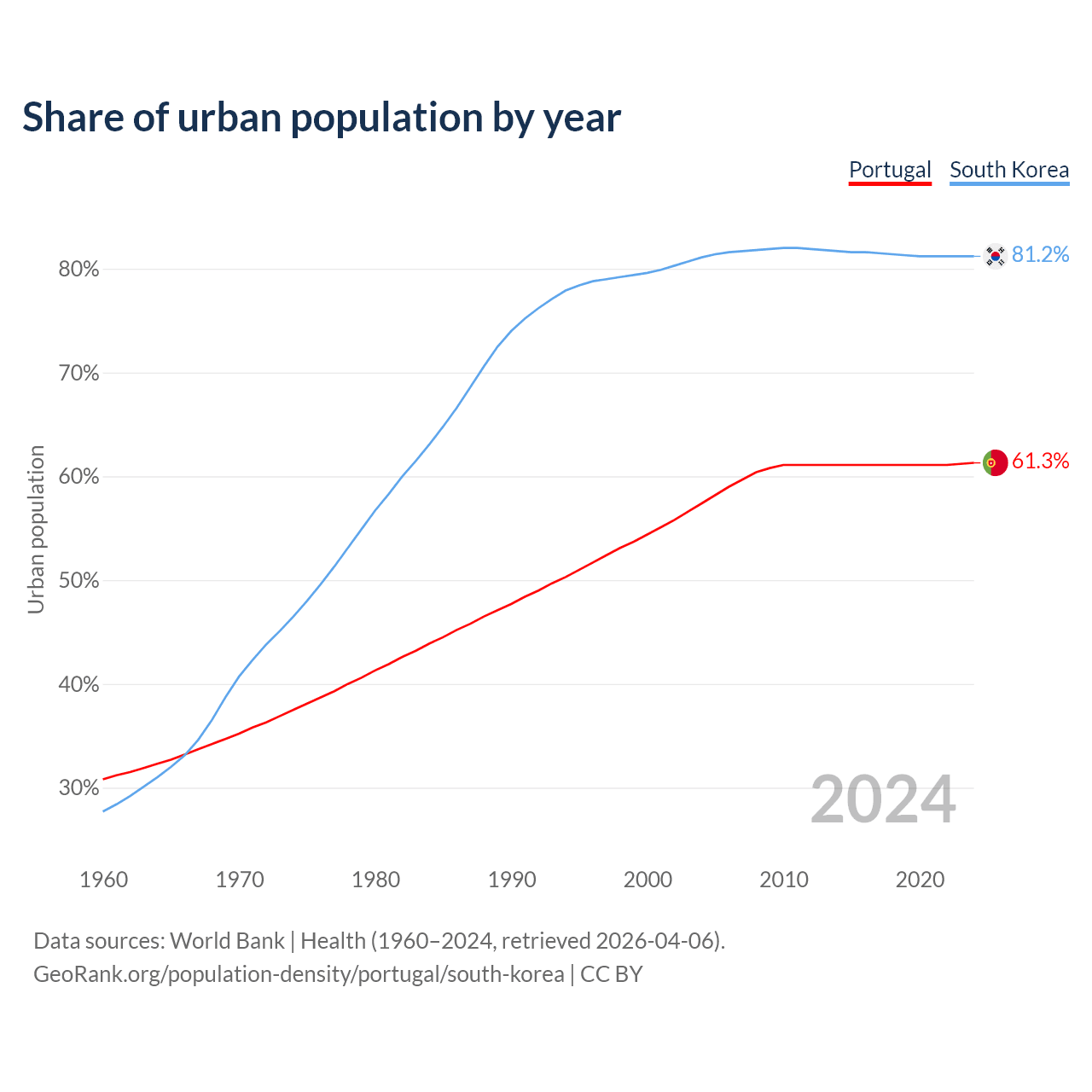From 2004 to 2024, the share of urban population changed from 57.4% to 61.3% in Portugal and from 81.1% to 81.2% in South Korea.