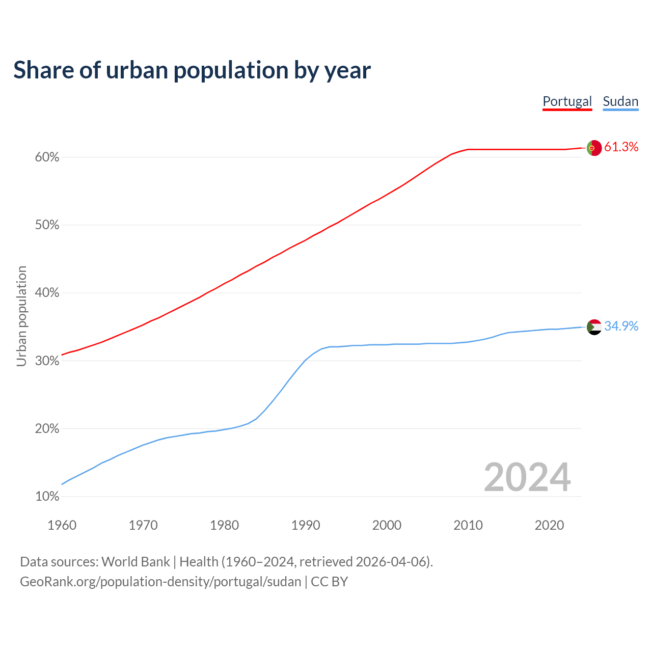 From 2004 to 2024, the share of urban population changed from 57.4% to 61.3% in Portugal and from 32.4% to 34.9% in Sudan.