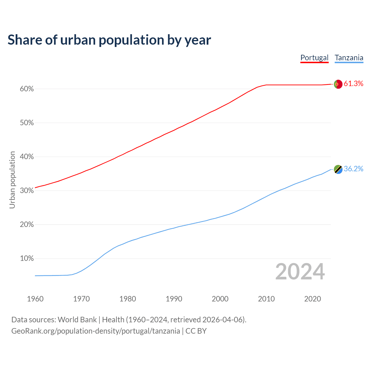 From 2004 to 2024, the share of urban population changed from 57.4% to 61.3% in Portugal and from 24.1% to 36.2% in Tanzania.