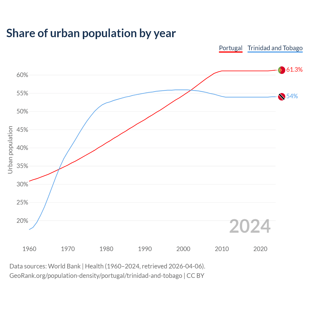 From 2004 to 2024, the share of urban population changed from 57.4% to 61.3% in Portugal and from 55.6% to 54% in Trinidad and Tobago.