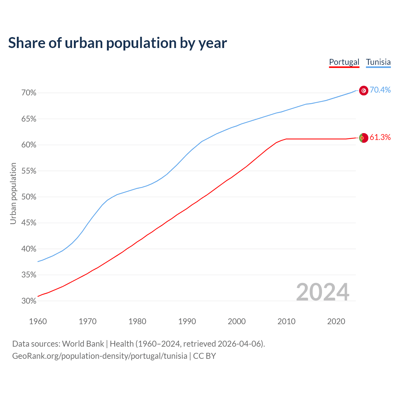 From 2004 to 2024, the share of urban population changed from 57.4% to 61.3% in Portugal and from 64.9% to 70.4% in Tunisia.