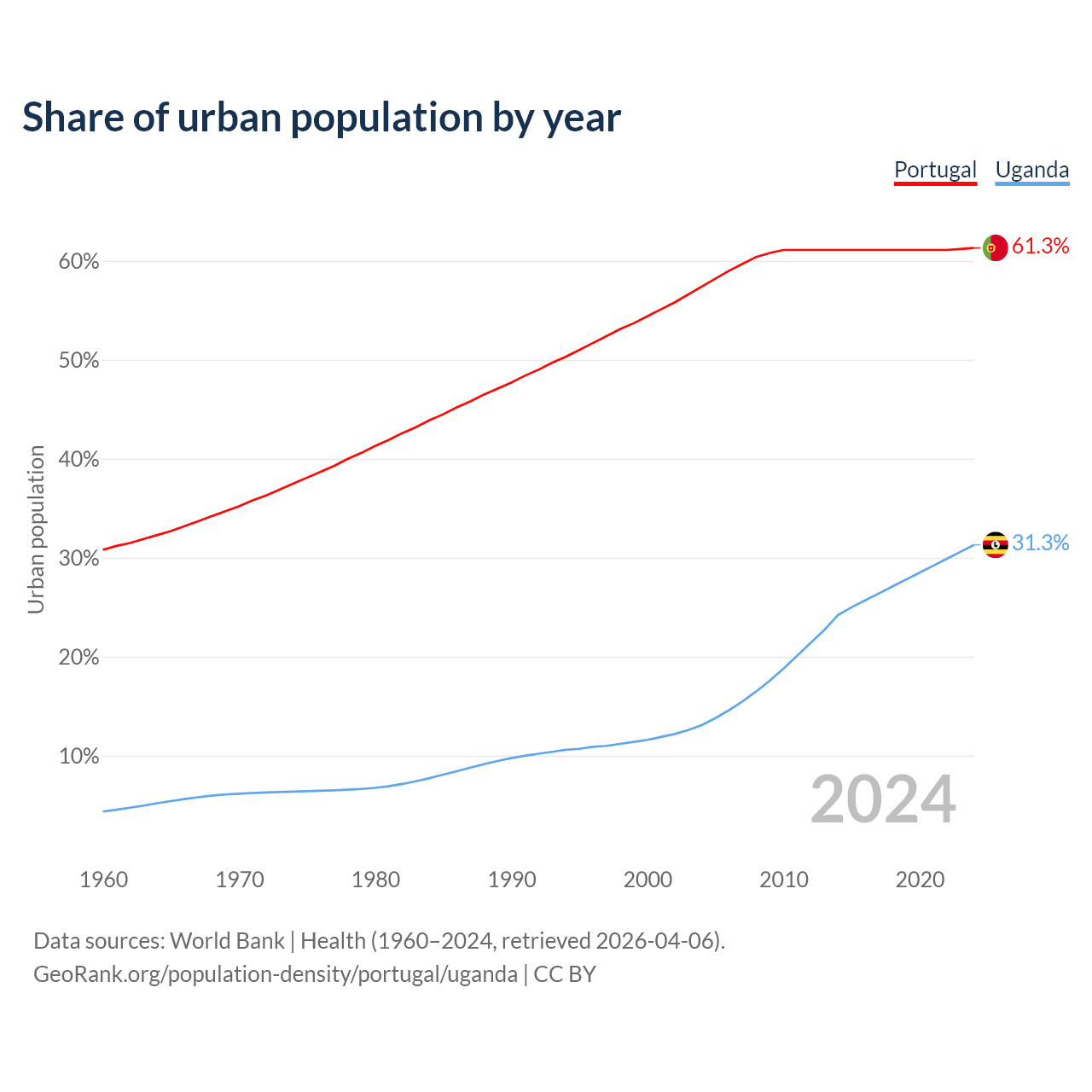 From 2004 to 2024, the share of urban population changed from 57.4% to 61.3% in Portugal and from 13.1% to 31.3% in Uganda.